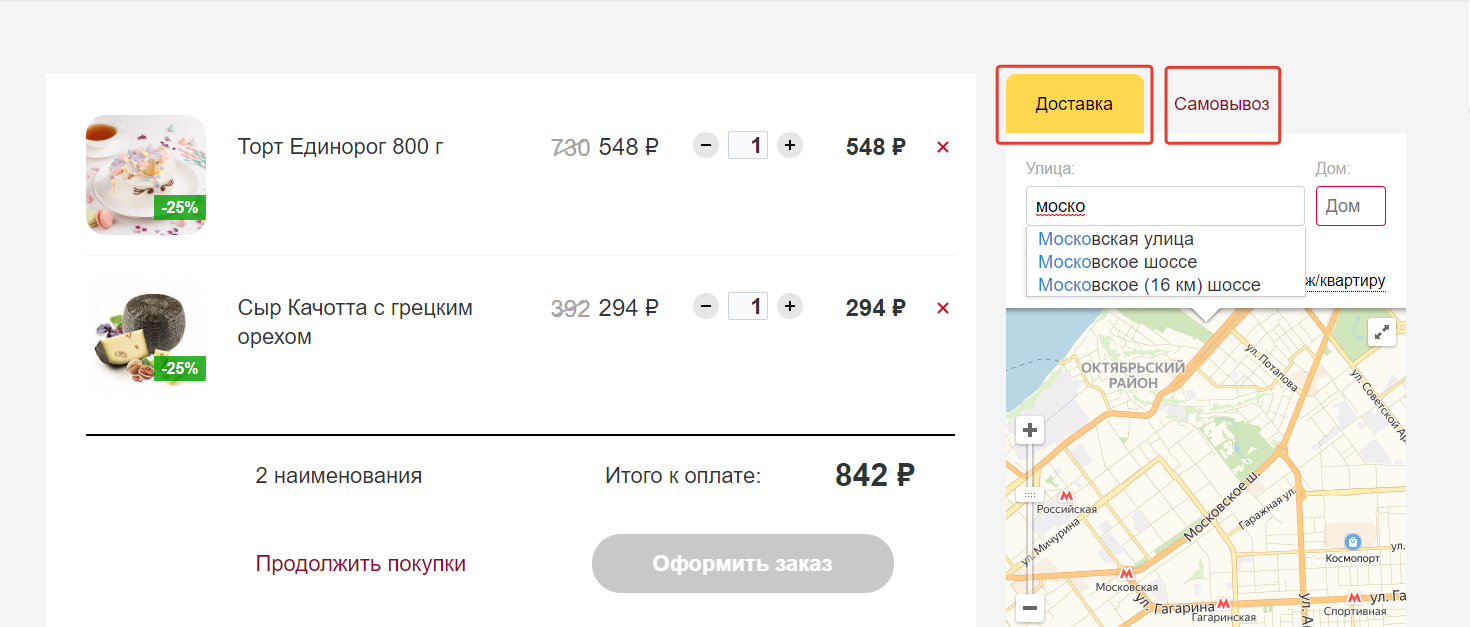2. Укажите способ получения заказа (доставка или самовывоз). Затем укажите адрес доставки или магазин, из которого вам будет удобно забрать заказ.