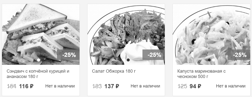Если товар в каталоге или на детальной странице закрашен серым цветом, это означает, что в выбранном магазине он закончился и не доступен к заказу на сегодняшний день.